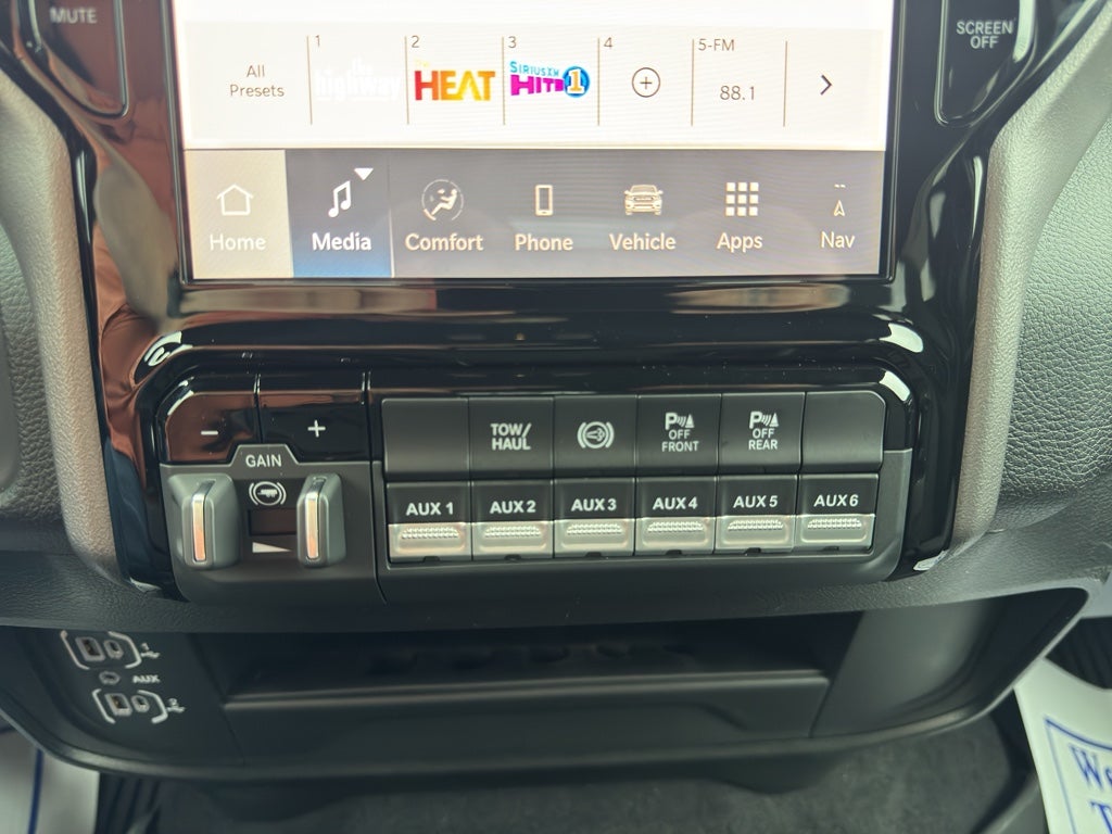 Quick Order Package 24Z Big Horn. Max Tow Package. Towing Technology Group: Center Stop Lamp with Cargo View Camera; Surround View Camera System; Blind Spot and Cross Path Detection; Trailer Tire Pressure Monitoring System; Trailer Reverse Guidance. Big Horn Level 1 Plus Equipment Group: Google Android Auto; SiriusXM Radio Service; For Details Visit DriveUconnect.com; For More Info. Call 800-643-2112; Integrated Voice Command with Bluetooth®; Emergency Vehicle Alert System (EVAS); 12" Touchscreen Display; Cloth 40/20/40 Premium Bench Seat; Glove Box Lamp; Auto Power-Folding Mirrors; Footwell Courtesy Lamp; Mirror Running Lights; MOPAR Deployable Bed Step; Alexa Built-In; Apple CarPlay; Power-Adjustable Convex Aux Mirrors; Forward and Reverse Utility Lights; Locking Lower Glove Box; Remote Start System; 9 Alpine Speakers with Subwoofer; Disassociated Touchscreen Display; Dual Glove Boxes; 2nd Row in Floor Storage Bins; Rear View Auto Dim Mirror; Rear Dome with On/off Switch Lamp; LED Bed Lighting; Connectivity - US/Canada; GPS Navigation; 4G LTE Wi-Fi Hot Spot; GPS Antenna Input; Exterior Mirrors with Heating Element; SiriusXM with 360L; Global Telematics Box Module; Connected Travel and Traffic Services; Foam Bottle Insert (door Trim Panel); Black Exterior Mirrors; Big Horn Instrument Panel Badge; Off-Road Information Pages; Selectable Tire Fill Alert; Trailer Tow Pages; HD Radio; Uconnect 5 Navigation with 12.0" Display Radio; Power Heated Fold Telescopic Mirrors; Exterior Mirrors with Supplemental Signals; Steering Wheel Mounted Audio Controls; Exterior Mirrors Courtesy Lamps; Air Conditioning ATC with Dual Zone Control; MOPAR Spray in Bedliner; Power Adjust Mirrors; Luxury Steering Wheel; Power Telescoping Mirrors. Heated Seats and Wheel Group: Heated Front Seats; Heated Steering Wheel. Dual Rear Wheels: Clearance Lamps; LT235/80R17E BSW All Season Tires; 17" Steel Spare Wheel; Box and Rear Fender Clearance Lamps; Center Hub; 6000# Front Axle with Hub Extension; 17" X 6.0" Polished Aluminum Wheels; Nexen Brand Tires; 14. 000 Lb GVWR; Rear Wheelhouse Liners. Quick Order Package 2UZ Big Horn. Cloth 40/20/40 Premium Bench Seat. Chrome Flat Cab-Length Side Steps. Blind Spot and Cross Path Detection. 5th Wheel/gooseneck Towing Prep Group. 50 Gallon Fuel Tank. Remote Start System. Silver Zynith. Instrument Panel Mounted Auxiliary Switches. MOPAR Front and Rear Rubber Floor Mats. Rear Wheelhouse Liners. Clearance Lamps. Power 2-Way Driver Lumbar Adjust. Transfer Case Skid Plate Shield. **Equipment listed is based on original vehicle build and subject to change. Please confirm the accuracy of the included equipment by calling the dealer prior to purchase.**